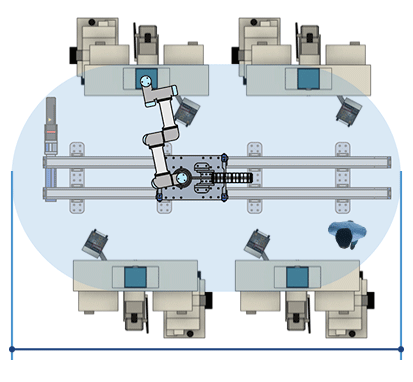 • Movotrak 7th axis can be mounted with any UR robot, including the UR20, in all directions (horizontally, wall-mounted, inverted, etc.).